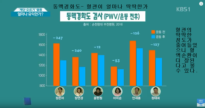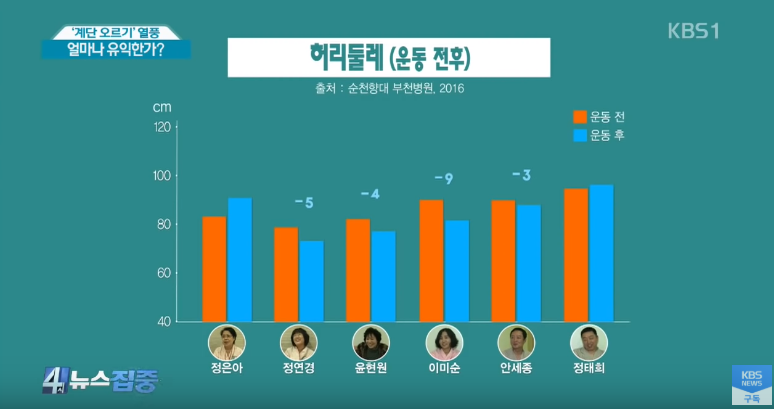 계단 오르기 다이어트를 5분이상 지속적으로 하게 되면 에너지를 우리 몸에 좋지 않은 내장지방에서 끌어다 쓰게 된다. 내장지방을 감소시켜 주게 되면 혈당과 콜레스테롤, 중성지방이 감소되어 동맥경화가 호전되고 혈압도 떨어뜨릴 수가 있다.